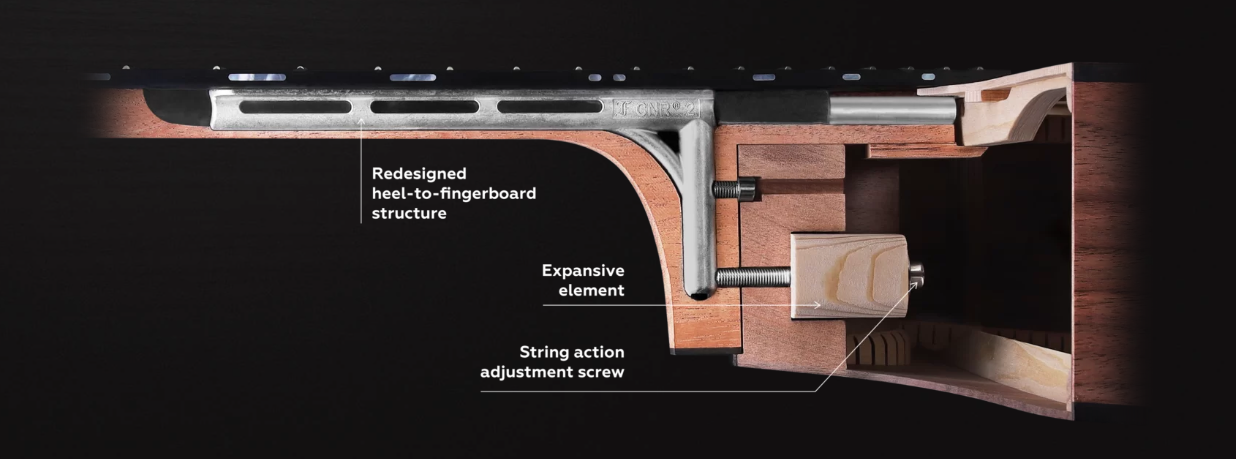 Centraal in de constructie staat het CNR Active Truss Rod Systeem, het meest geavanceerde halssysteem dat Furch bouwt. Het CNR Active systeem biedt uitzonderlijke halsbalans en stabiliteit, ook bij wisselende temperaturen en luchtvochtigheid. De hals is bovendien eenvoudig en nauwkeurig afstelbaar naar jouw persoonlijke speelvoorkeur. Op een instrument van dit niveau is dat geen bijzaak: het garandeert dat de Red Deluxe altijd op zijn best speelt. Het kenmerkende Soft V-halsprofiel maakt het speelcomfort compleet.