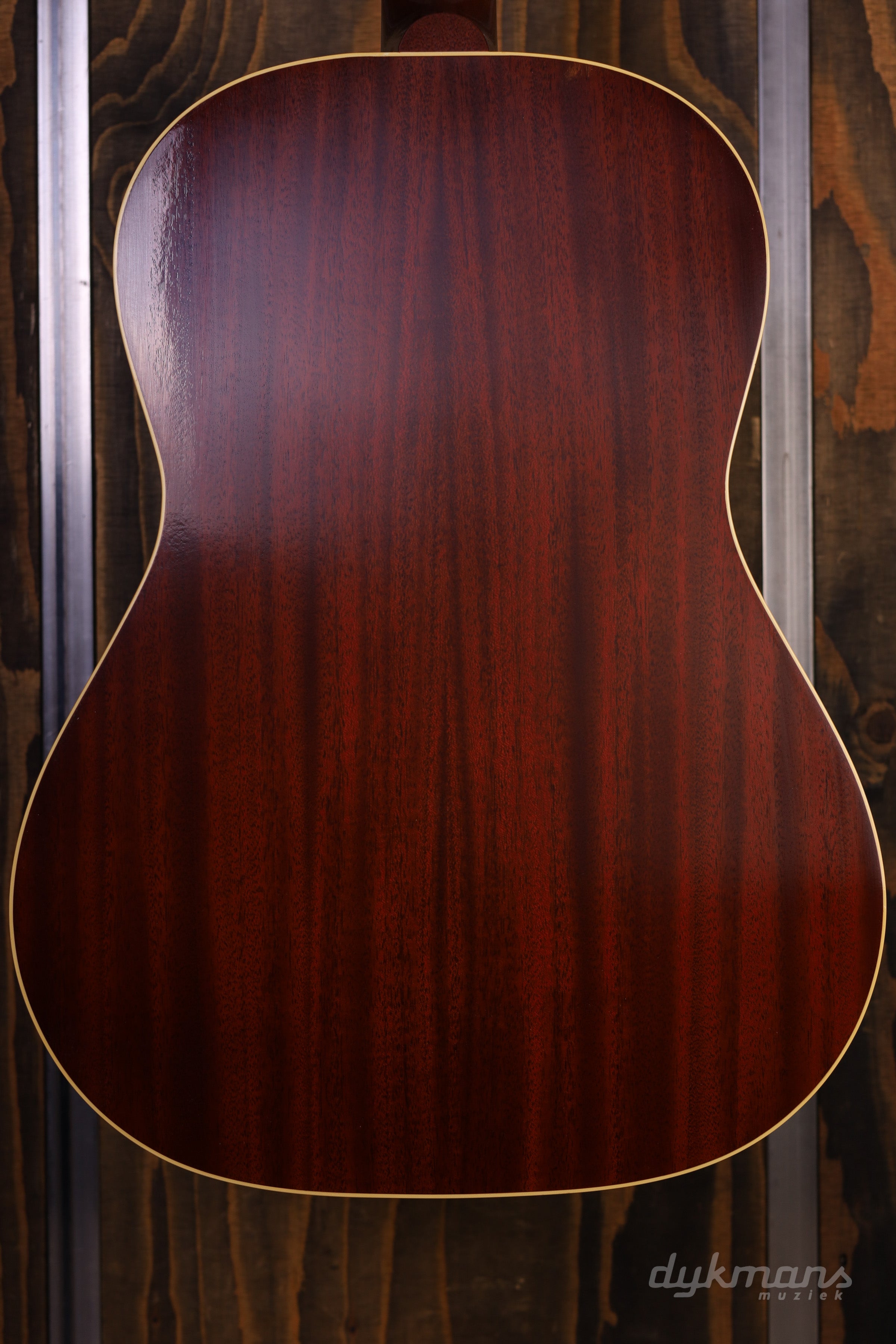 Het thermisch verouderde rode Adirondack sparren bovenblad geeft deze gitaar een rijke, volwassen klank met veel harmonische diepte, vergelijkbaar met een instrument dat al tientallen jaren is bespeeld. De mahoniehouten hals is gesneden in een historisch correct profiel, afgewerkt met zijdezacht palissander en traditioneel bevestigd met een samengestelde zwaluwstaartverbinding voor maximale resonantie.
