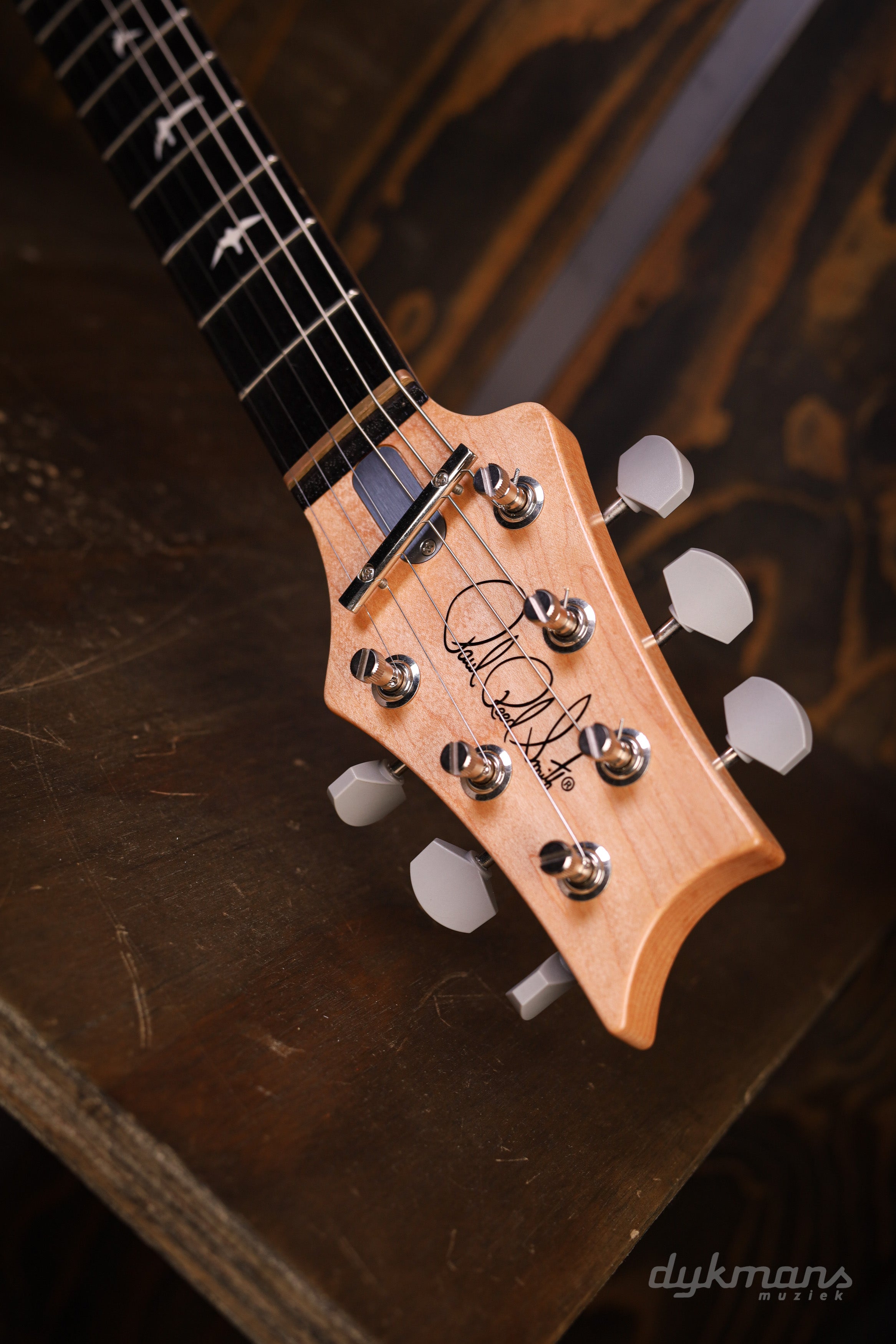 Waar een standaard Silver Sky een alder body heeft, is deze Dead Spec uitgevoerd met een lichtgewicht swamp ash body. De Moc Sand satin nitro afwerking is dun aangebracht en trekt subtiel in de nerf van het essenhout, wat zorgt voor een open resonantie en een doorleefde uitstraling. De brug is gebaseerd op de PRS Gen III tremolo, maar is vastgeschroefd op de body en functioneert daardoor als een string-through hardtail. Het behoud van het messing tremoloblok voegt een duidelijke warmte en muzikale diepte toe aan de klank.