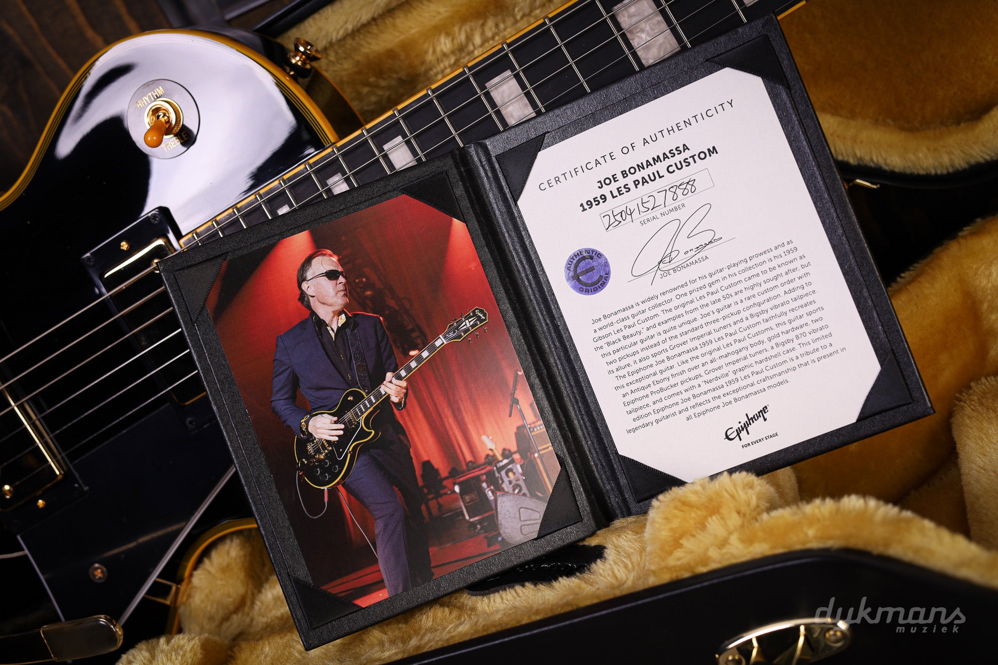 The guitar comes with a certificate of authenticity and a deluxe hardshell case with "Nerdville" graphics. This limited edition Epiphone Joe Bonamassa '59 Les Paul Custom is not only a tribute to a legendary guitarist and an iconic model, but also a beautiful piece of craftsmanship that will delight any guitarist.